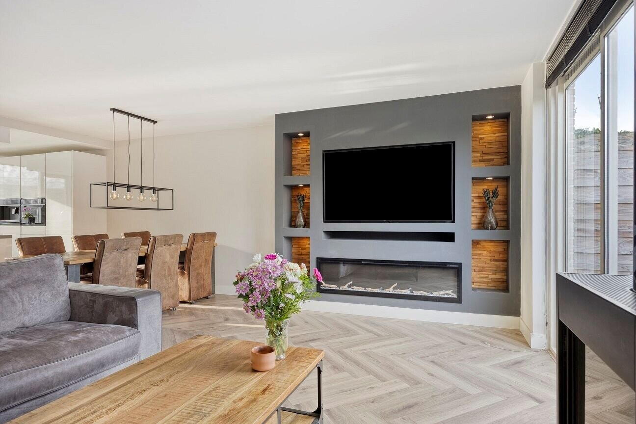De royale woonkamer biedt volop ruimte voor een gezellige zithoek en een grote eettafel. Dankzij de schuifpui heeft u direct toegang tot de zonnige achtertuin op het noordwesten. Hier vindt u een terrasoverkapping met roldeur, waardoor u optimaal kunt genieten van lange zomeravonden – in de zon of juist in de schaduw.