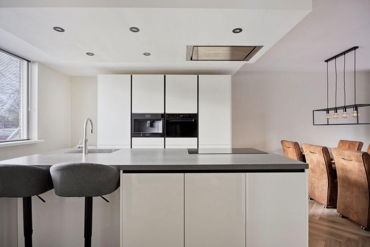 Aan de voorzijde van de woning bevindt zich de luxe open keuken met kookeiland. De keuken is voorzien van hoogwaardige inbouwapparatuur van Bauknecht, waaronder een combimagnetron, vaatwasser, koelkast en een 5-pits kookplaat. De ingebouwde afzuigkap van Novi is stijlvol verwerkt in het kookeiland. Daarnaast beschikt de keuken over een ingebouwde koffiemachine en een Quooker – ideaal voor de kookliefhebber.